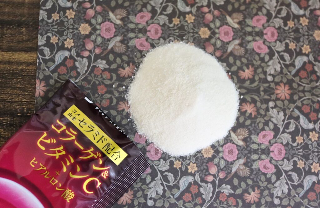 低分子コラーゲンペプチドというだけあって、パウダーの粒は細かく、さっと舌の上で溶けるような食感です。