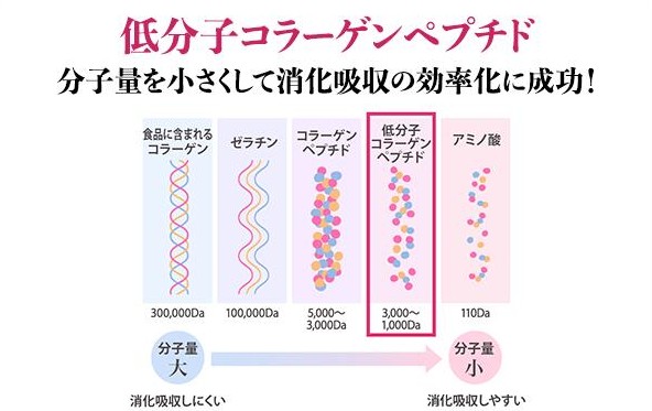 通常の食品に含まれるコラーゲンの分子量は約300,000DAで、分子量が大きいため、吸収がむずかしく、コラーゲンが必要な場所に届きにくいというデメリットがあります。