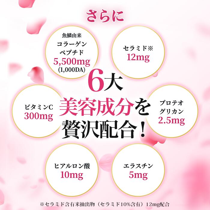 『コラーゲン&ビタミンC』には、低分子コラーゲンペプチド、ビタミンC、ヒアルロン酸、プロテオグリカン、セラミド、エラスチン等美容に欠かせない6大美容成分が贅沢に配合されています。