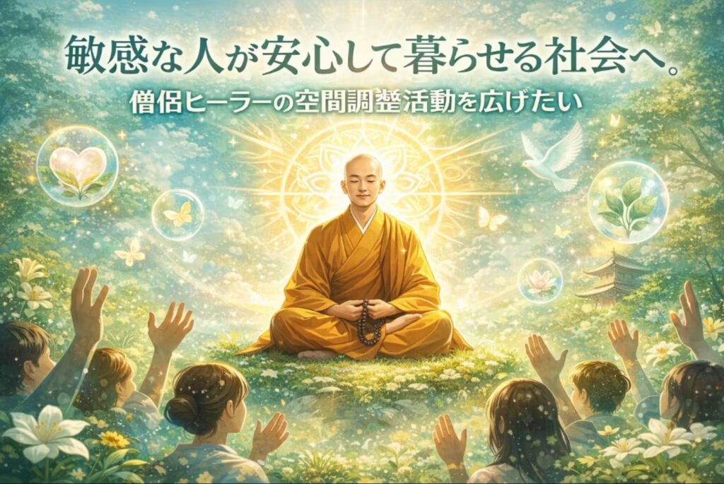 周囲の環境から影響を受けやすい体質で、疲れてしまいやすい傾向のある方が安心して暮らせる社会をつくりたい…そんな想いを大切にし、僧侶ヒーラーとしての特技を生かした「ヒーリング体験」をお届けするための企画を実践中です。